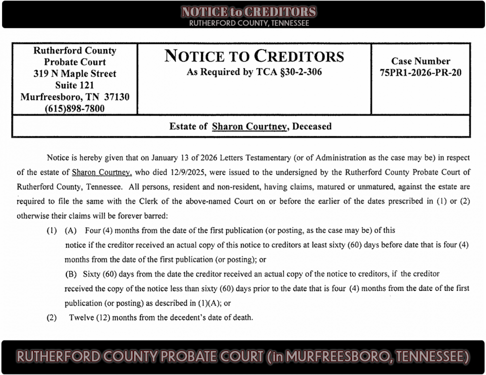 Notice is hereby given that on January 13 of 2026 Letters Testamentary (or of Administration as the case may be) in respect of the estate of Sharon Courtney, who died 12/9/2025, were issued to the undersigned by the Rutherford County Probate Court of Rutherford County, Tennessee. All persons, resident and non-resident, having claims, matured or unmatured, against the estate are required to file the same with the Clerk of the above-named Court on or before the earlier of the dates prescribed in (1) or (2) otherwise their claims will be forever barred: