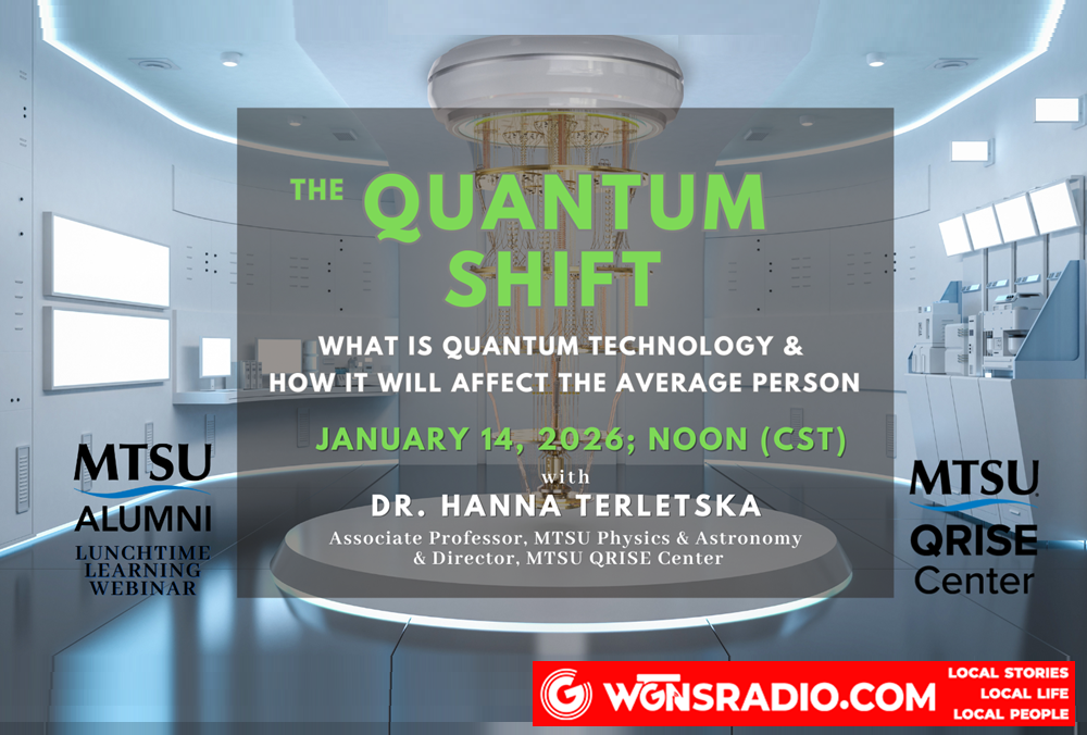 MURFREESBORO, TN (WGNS) - Middle Tennessee State University is rolling out another alumni perk tomorrow, and this one sounds like it came straight from a sci‑fi script. The Quantum Shift—a free lunchtime webinar on Wednesday, Feb. 4, 2026
