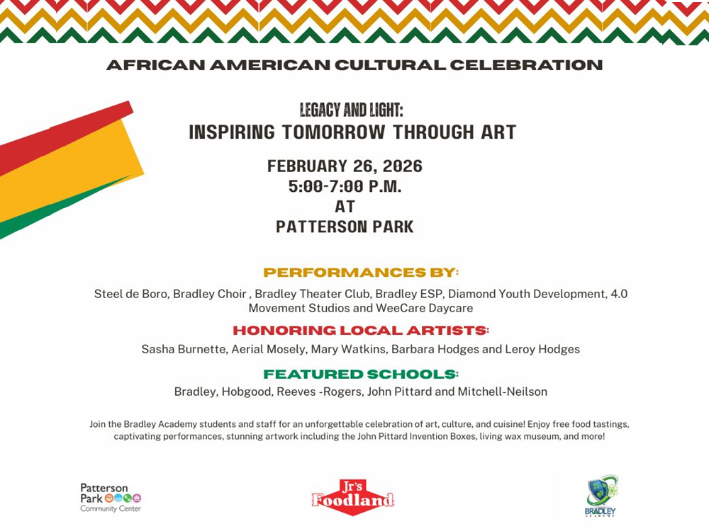 The event will take place Thursday, February 26, 2026, from 5:00 to 7:00 p.m., at Bradley Academy in conjunction with Patterson Park. This year’s theme, “Legacy and Light: Inspiring Tomorrow Through Art,” emphasizes the importance of honoring African American heritage while inspiring future generations through artistic expression.