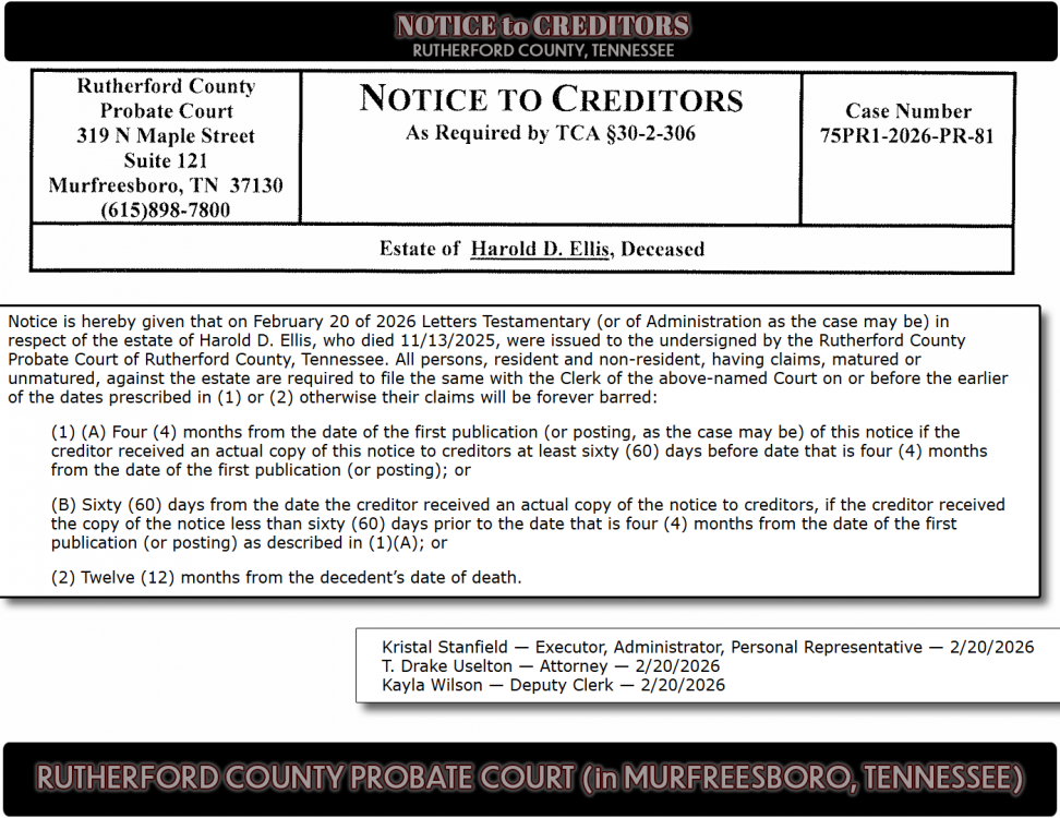 Notice is hereby given that on February 20 of 2026 Letters Testamentary (or of Administration as the case may be) in respect of the estate of Harold D. Ellis, who died 11/13/2025, were issued to the undersigned by the Rutherford County Probate Court of Rutherford County, Tennessee. All persons, resident and non-resident, having claims, matured or unmatured, against the estate are required to file the same with the Clerk of the above-named Court on or before the earlier of the dates prescribed in (1) or (2) otherwise their claims will be forever barred: