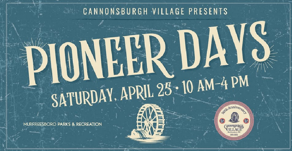 Sat. (April 25, 2026) 10AM - 4PM Pioneer Days at Cannonsburgh Village (312 S. Front St., Murfreesboro). Step back in time and stroll through the old village and see demonstrations, incredible live music, and clogging. Shop leisurely at the many handmade craft vendors and enjoy tasty treats from various food trucks. The Art League will have an amazing selection of art to view and purchase, and the Car Show will also be on-site. It's a unique chance to step back in time and experience life from years past. For all ages. Free admission! If you have questions, contact Cannonsburgh Village at 615-890-0355 or mbnevills@murfreesborotn.gov for more information. Cannonsburgh is a part of Murfreesboro Parks and Recreation Department.