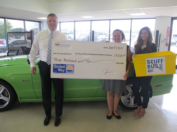 Ford of Murfreesboro has joined with United Way of Rutherford and Cannon Counties and over twenty area businesses for the second annual Stuff the Bus campaign to promote literacy and reading proficiency in children pre-K through 3rd grade in Rutherford and Cannon Counties. Through the Stuff the Bus program Ford of Murfreesboro has donated $3,000 to build 300 literacy kits and will be helping to collect school supplies and new or gently used books to create additional kits for up to one thousand children. The Stuff the Bus program is working to increase the reading level of 3rd graders from the 46% of students who were reading at proficiency level in 2012. The impact of the Stuff the Bus program helps to raise the probability that a child reading at a proficient level by 3rd grade will graduate from high school as referenced in a study posted on www.tn.gov.