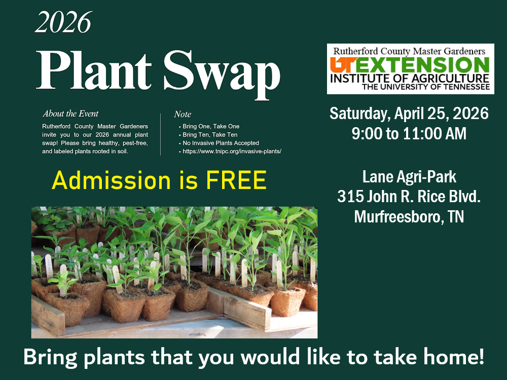 Sat. (April 25, 2026) 9:00 - 11:00AM The Rutherford County Master Gardeners invite gardeners, plant lovers, and green thumbs of all levels to their 2026 Rutherford County Master Gardeners' Annual Plant Swap at the Lane Agri-Park (315 John R. Rice Blvd., Murfreesboro). This free community event is an excellent opportunity to exchange plants, share gardening knowledge, and connect with fellow enthusiasts. Participants are encouraged to bring healthy, pest-free, and labeled plants rooted in soil. The swap operates on a simple exchange system: Bring one plant, take one! Bring ten plants, take ten! It's all FREE and everyone is welcome! For more information, contact jonmheatherly@gmail.com or visit Rutherford County Master Gardeners' Facebook page.