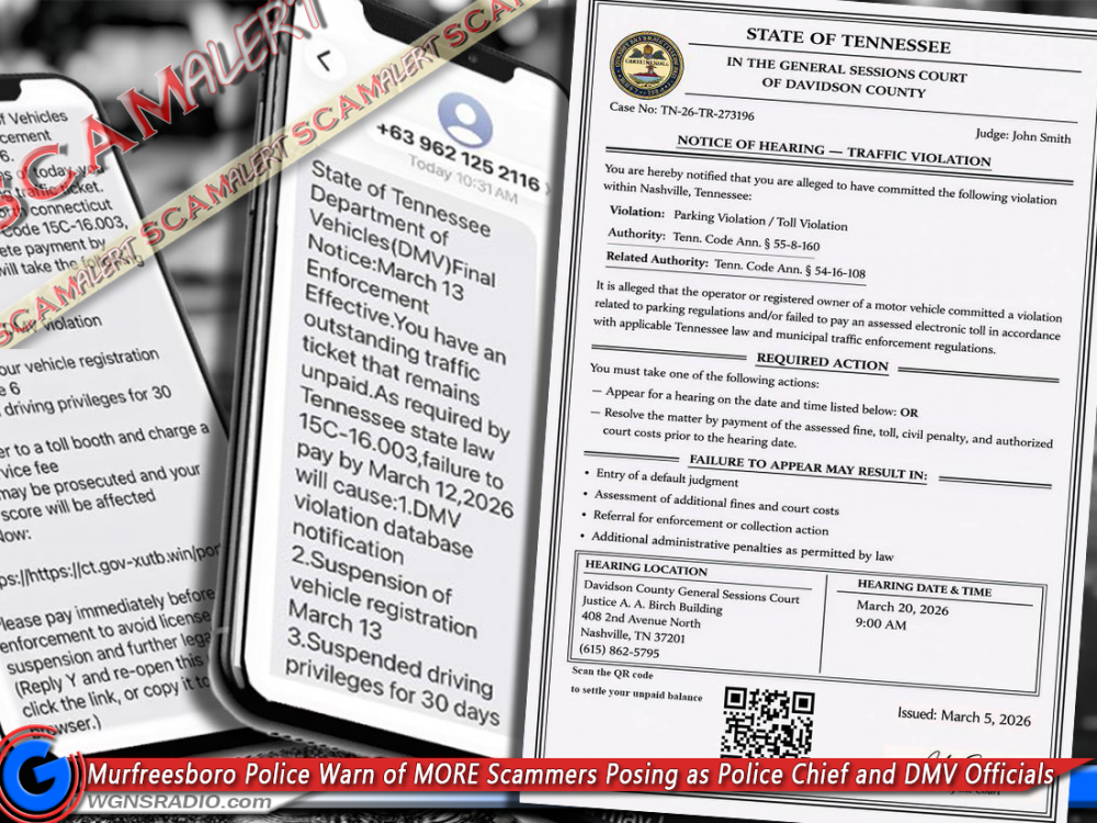 MURFREESBORO, Tenn. — Fraud detectives with the Murfreesboro Police Department are warning residents about two separate scams circulating in the area—one involving callers impersonating the city’s police chief and another using fake text messages posing as DMV officials.