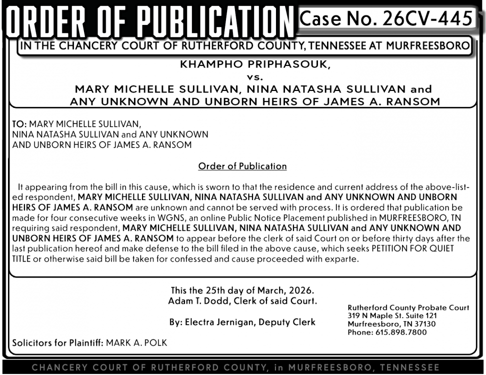 It appearing from the bill in this cause, which is sworn to that the residence and current address of the above-listed respondent, MARY MICHELLE SULLIVAN, NINA NATASHA SULLIVAN and ANY UNKNOWN AND UNBORN HEIRS OF JAMES A. RANSOM are unknown and cannot be served with process. It is ordered that publication be made for four consecutive weeks in WGNS, an online Public Notice Placement published in MURFREESBORO, TN requiring said respondent, MARY MICHELLE SULLIVAN, NINA NATASHA SULLIVAN and ANY UNKNOWN AND UNBORN HEIRS OF JAMES A. RANSOM to appear before the clerk of said Court on or before thirty days after the last publication hereof and make defense to the bill filed in the above cause, which seeks PETITION FOR QUIET TITLE or otherwise said bill be taken for confessed and cause proceeded with exparte.