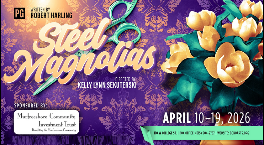Fri-Sat 7:30PM / Sat.-Sun 2PM (April 10-19, 2026) Robert Harling's "Steel Magnolias" graces the stage y'all at the Center for the Arts, 110 W. College St., uptown Murfreesboro. Steel Magnolias follows a tight‑knit group of women in a small Louisiana town who gather regularly at Truvy’s beauty salon, sharing humor, heartache, and the everyday grit of Southern life. At the center is Shelby, a young woman with diabetes whose decision to have a child brings both joy and risk. As the women support one another through weddings, illness, and loss, their bond becomes a lifeline. The story blends sharp wit with deep emotional resilience, showing how friendship can carry people through even the hardest seasons. For more information visit http://boroarts.org or phone (615) 904-ARTS (2787).