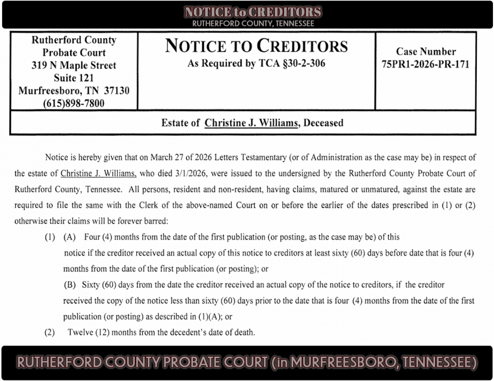 Notice is hereby given that on March 27 of 2026 Letters Testamentary (or of Administration as the case may be) in respect of the estate of Christine J. Williams, who died 3/1/2026, were issued to the undersigned by the Rutherford County Probate Court of Rutherford County, Tennessee. All persons, resident and non-resident, having claims, matured or unmatured, against the estate are required to file the same with the Clerk of the above-named Court on or before the earlier of the dates prescribed in (1) or (2) otherwise their claims will be forever barred: