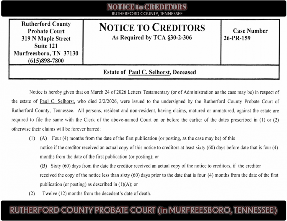 Notice is hereby given that on March 24 of 2026 Letters Testamentary (or of Administration as the case may be) in respect of the estate of Paul C. Selhorst, who died 2/2/2026, were issued to the undersigned by the Rutherford County Probate Court of Rutherford County, Tennessee. All persons, resident and non-resident, having claims, matured or unmatured, against the estate are required to file the same with the Clerk of the above-named Court on or before the earlier of the dates prescribed in (1) or (2) otherwise their claims will be forever barred: