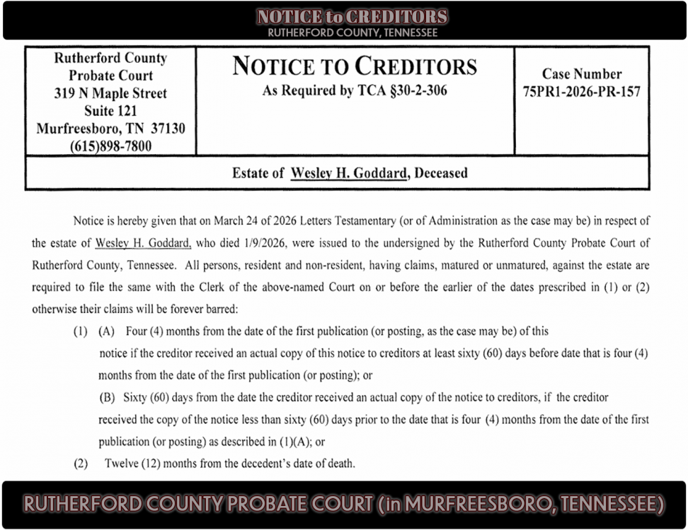 Notice is hereby given that on March 24 of 2026 Letters Testamentary (or of Administration as the case may be) in respect of the estate of Wesley H. Goddard, who died 1/9/2026, were issued to the undersigned by the Rutherford County Probate Court of Rutherford County, Tennessee. All persons, resident and non-resident, having claims, matured or unmatured, against the estate are required to file the same with the Clerk of the above-named Court on or before the earlier of the dates prescribed in (1) or (2) otherwise their claims will be forever barred: