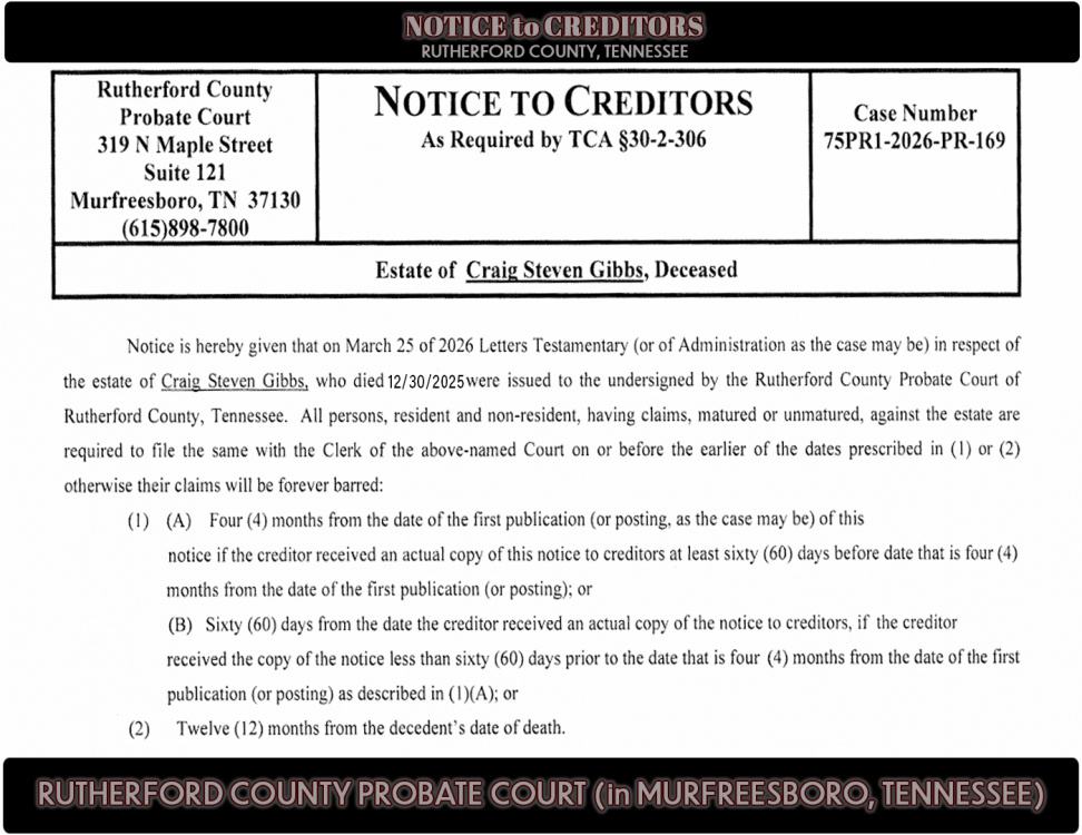Notice is hereby given that on March 25 of 2026 Letters Testamentary (or of Administration as the case may be) in respect of the estate of Craig Steven Gibbs, who died 12/30/25, were issued to the undersigned by the Rutherford County Probate Court of Rutherford County, Tennessee. All persons, resident and non-resident, having claims, matured or unmatured, against the estate are required to file the same with the Clerk of the above-named Court on or before the earlier of the dates prescribed in (1) or (2) otherwise their claims will be forever barred: