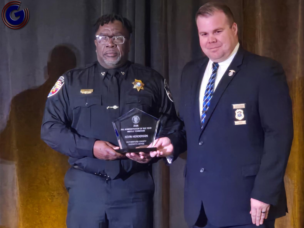 Photo above article: Deputy Chief Kevin Henderson, left, of the Rutherford County Adult Detention Center receives the Middle Tennessee Jail Administrator of the Year Award from Executive Director William Wall of the Tennessee Corrections institute.