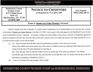 Rutherford County Probate Court319 N Maple St. Suite 121Murfreesboro, TN 37130Phone: 615.898.7800 Notice to CreditorsAs Required by by TCA §30-2-306 Estate of Sandra Le.... Read More