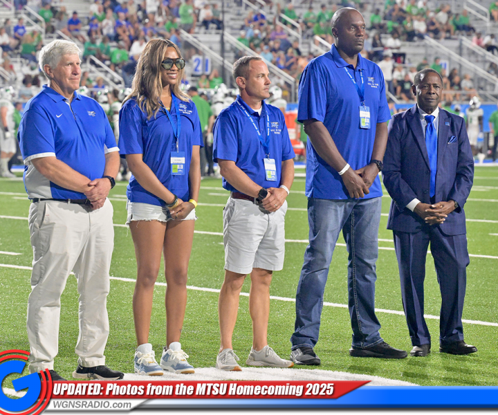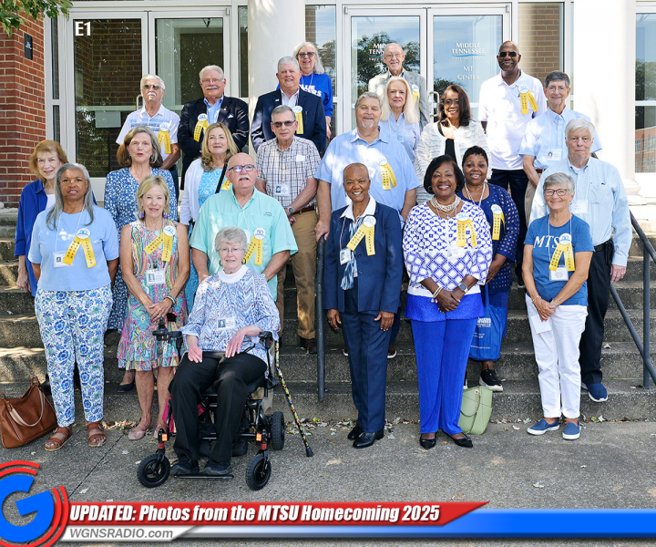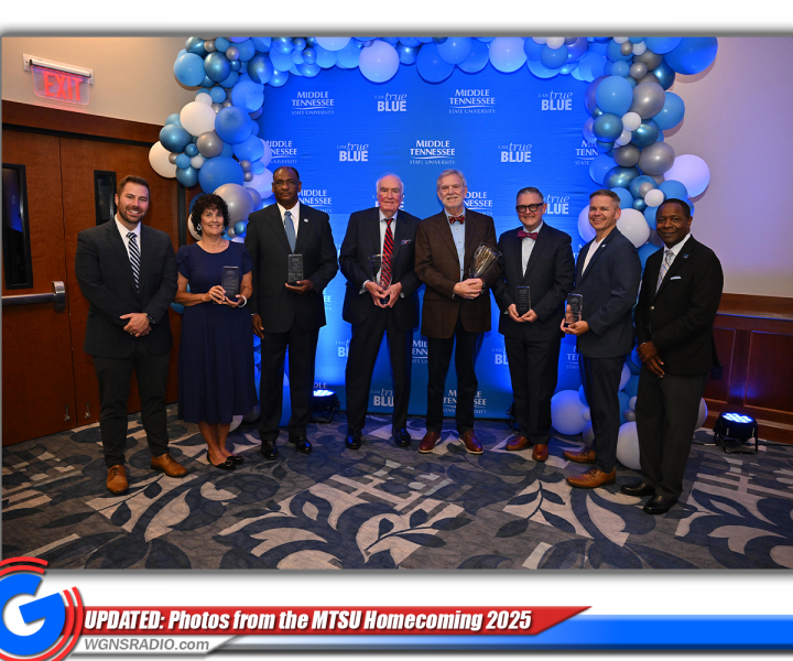 Shown with Middle Tennessee State University Alumni Board President Patrick Morrison (Class of 2012), far left. of Nashville, Tenn., and MTSU President Sidney A McPhee, far right, are 2025-26 Distinguished Alumni and True Blue Citations of Distinction honorees, from left, Deidra Goins, of Manchester, Tenn., William “Bill” Roper of Stafford, Va., Hal Hardin and Keel Hunt, of Nashville, Tenn., Scott Cook, of Dyersburg, Tenn., and Chaney Mosley, of Nashville on Friday, Sept. 19, in the Sam Ingram Building on campus in Murfreesboro, Tenn. Young Alumni recipient Julien Baker, of Memphis, Tenn., was unable to attend. (MTSU photo by James Cessna)