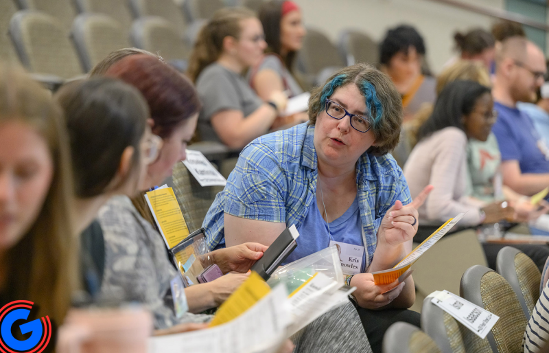 Bonny McCarty, an advisor in the College of Behavioral and Health Sciences at Middle Tennessee State University in Murfreesboro, Tenn., talks with her fellow participants in a poverty simulation held on campus recently. Participants were each assigned a character and family situation to navigate to mimic what it’s like to live below the poverty line. (MTSU photo by J. Intintoli)