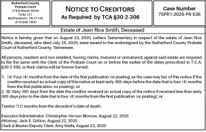 NOTICE TO CREDITORS: Estate of Jean Rice Smith, DeceasedCase Number: 75PR1-2025-PR-536